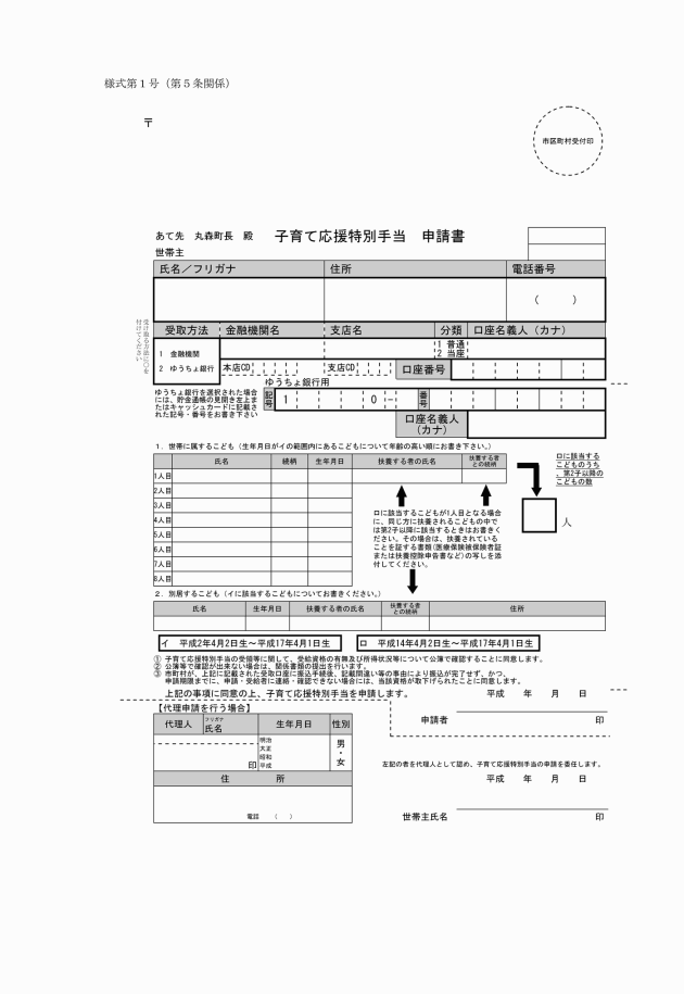 第5条 町長は、支給対象者に対し、丸森町子育て応援特別手当申請書(様式第1号。以下「申請書」という。)を送付するものとする。