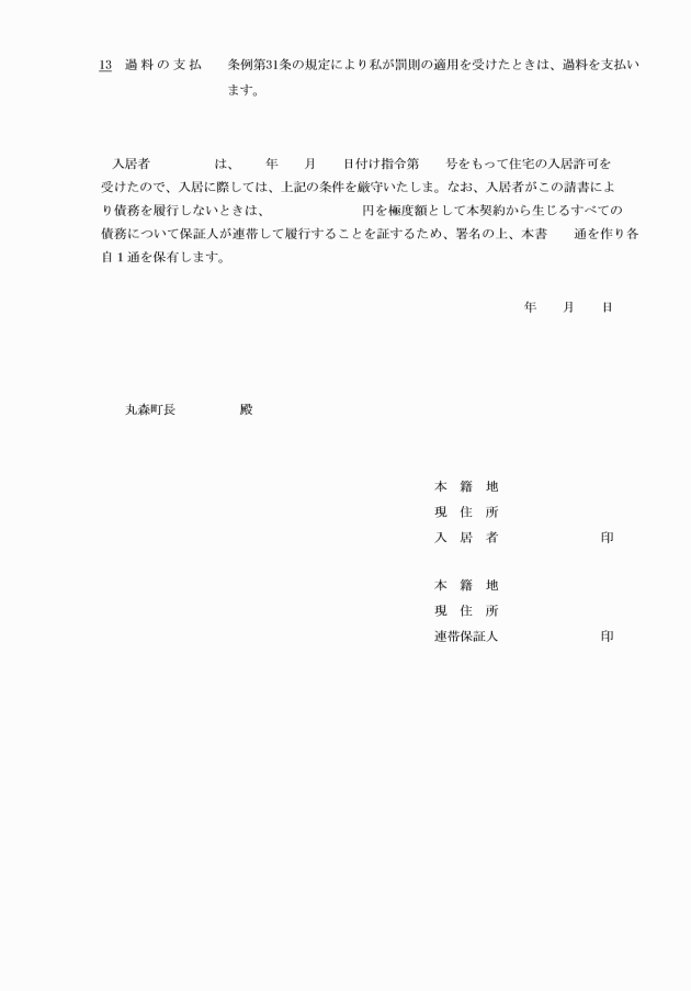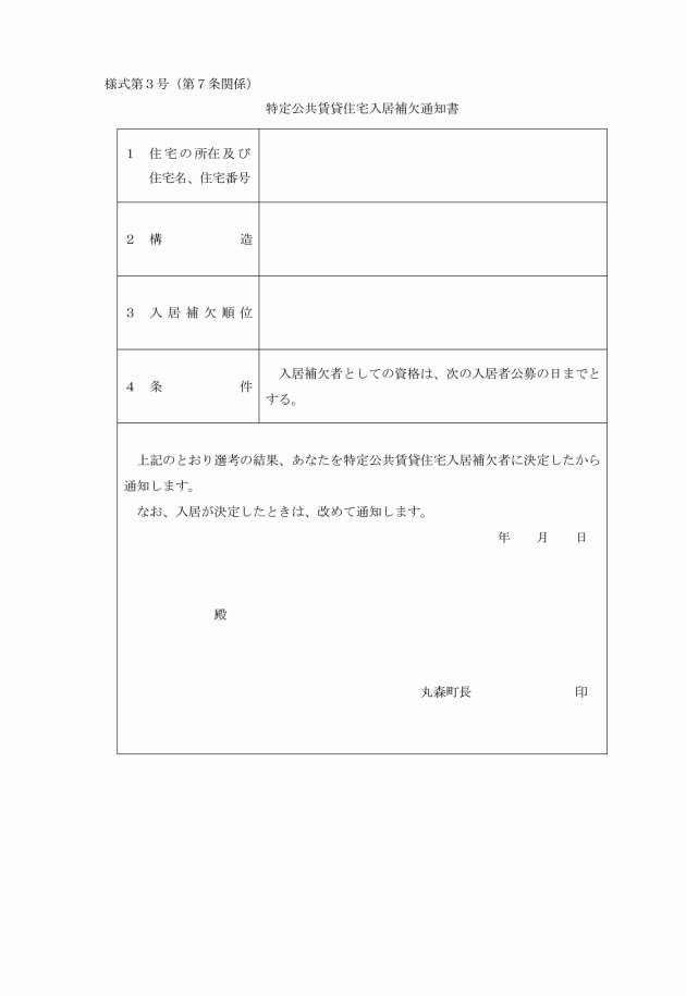 第10条 入居決定者が特定住宅に入居したときは、入居した日から15日以内に特定公共賃貸住宅入居届(様式第7号)に住民票の写しを添付して、町長に提出しなければならない。
