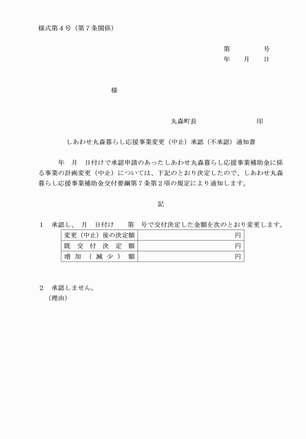 第7条 規則第5条第1項第1号及び第3号の規定による町長の承認を受けようとするときは、しあわせ丸森暮らし応援事業変更(中止)承認申請書(様式第3号)を町長に提出しなければならない。