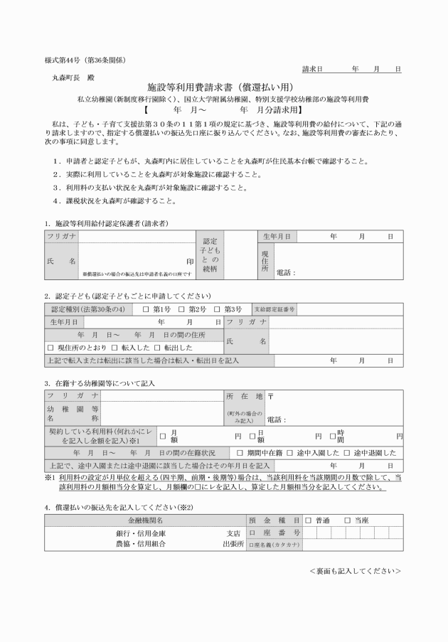 (2) 法第7条第10項第4号に掲げる施設又は同項第6号から第8号までに掲げる事業。施設等利用費請求書(償還払い用)(様式第45号)