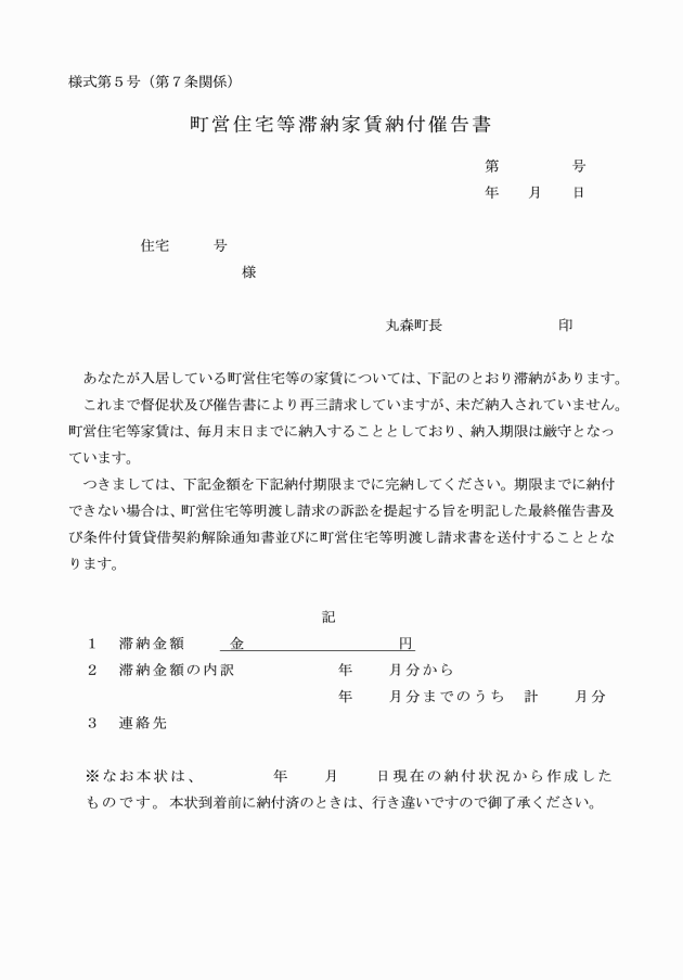 第3条 町長は、家賃等を1月滞納した滞納者に対し、地方自治法施行令(昭和22年政令第16号)第171条の規定により債務の履行を督促するため、当該月の翌月20日までに督促状(様式第1号)を普通郵便により送付するものとする。